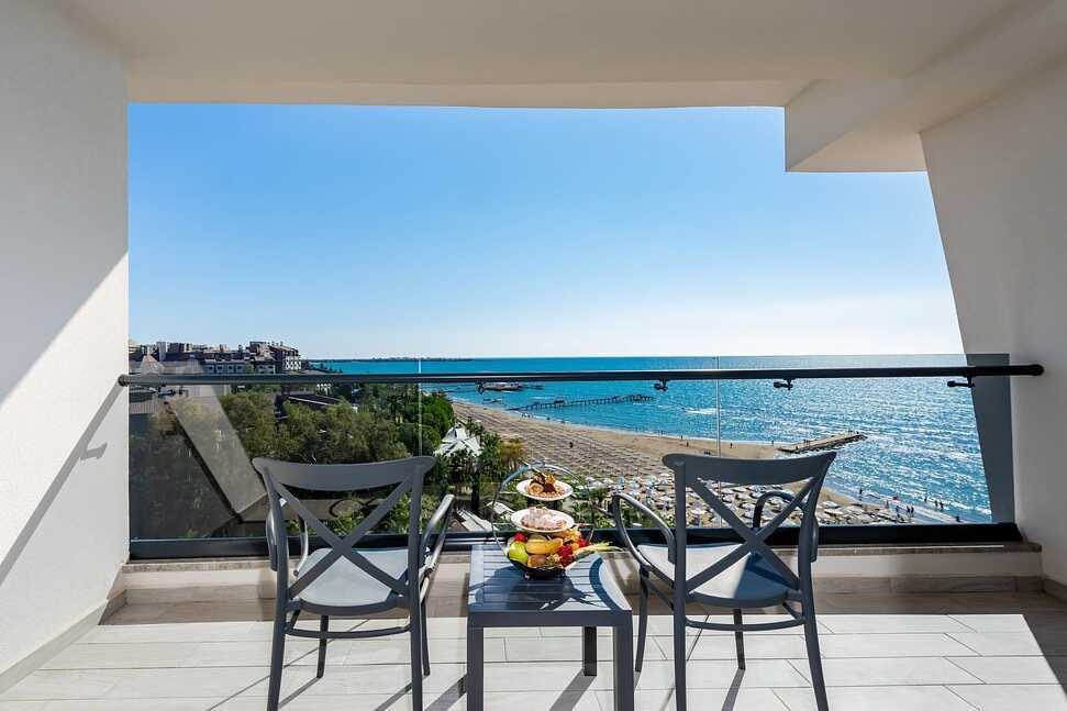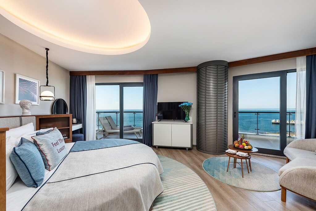 Större familjerum med balkong och begränsad havsutsikt. Två sovrum med en dubbelsäng eller två enkelsängar i varje. Wifi, luftkonditionering och deponering ingår. Minibar. Vattenkokare samt kaffe och te. Tv med internationella kanaler. Badrockar och tofflor. Hårtork. Två badrum med dusch och wc. Städning 7 ggr/vecka.