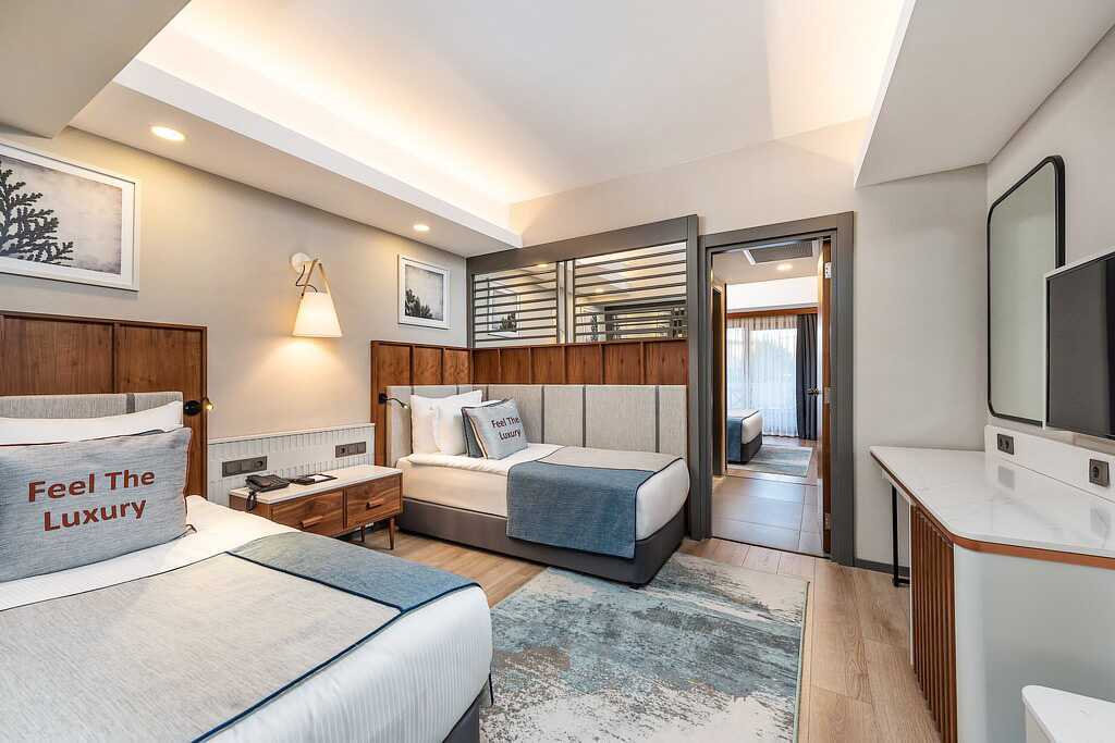 Familjrum med balkong och begränsad havsutsikt. Två sovrum med en dubbelsäng eller två enkelsängar i varje. Wifi, luftkonditionering och deponering ingår. Minibar. Vattenkokare samt kaffe och te. Tv med internationella kanaler. Badrockar och tofflor. Hårtork. Badrum med dusch och wc. Städning 7 ggr/vecka.